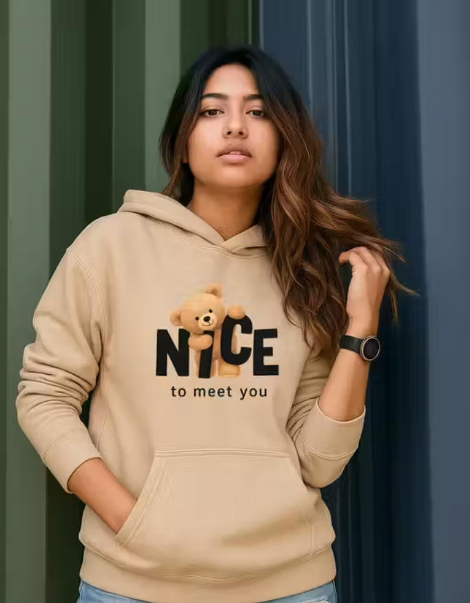Stay cozy and cute with this stylish teddy graphic hoodie featuring the adorable “Nice to Meet You” design. Made from soft fleece fabric, this hoodie offers ultimate comfort and warmth during chilly days. It comes with a classic hood, long sleeves, and a front kangaroo pocket for added convenience. Perfect for casual outings, college wear, travel, or lounging at home — this trendy hoodie adds a playful touch to your winter wardrobe. Pair it with jeans or joggers for an effortlessly cool look. teddy print hoodie women, cute fleece hoodie, trendy graphic hoodie, casual winter wear, nice to meet you hoodie, stylish hoodie for girls, soft warm sweatshirt, casual oversized hoodie, teddy bear design hoodie, women’s streetwear hoodie, fleece hoodies for girls, black graphic hoodie women, comfy winter hoodie Trendy Printed Teddy Graphic Fleece Hoodie for Women